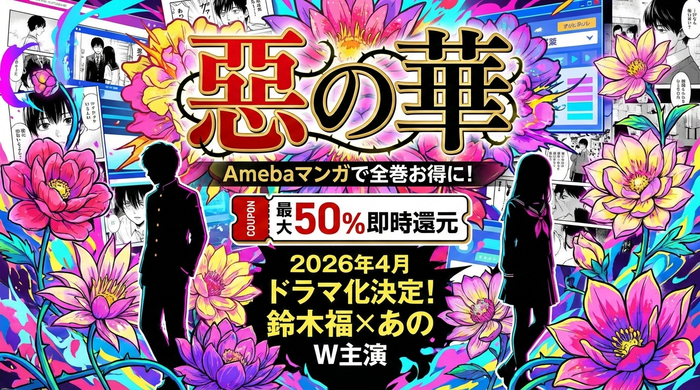 押見修造の問題作『惡の華(あくのはな)』は、Amebaマンガで全11巻すべて購入可能です。2026年4月にはテレビ東京でドラマ化(鈴木福×あの W主演)が決定し、いま再び注目が集まっています。新規会員なら100冊まで最大50%即時還元クーポンが使え、全巻約2,985円相当で一気読みできます。