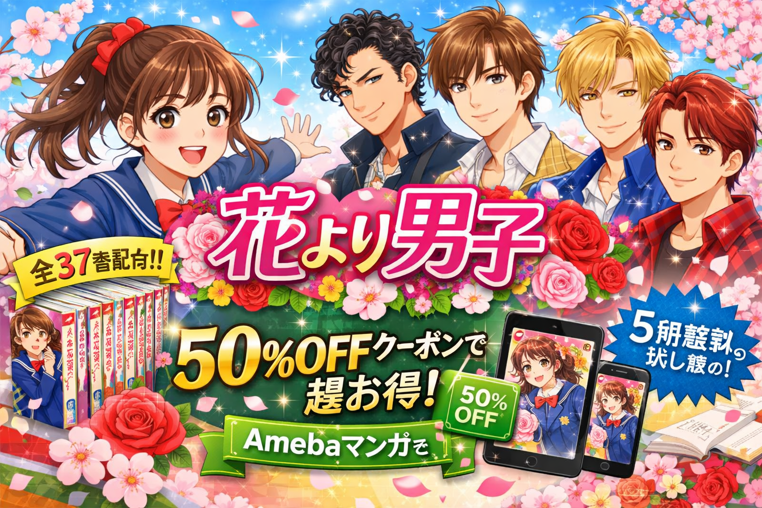 『花より男子』の漫画全37巻は、Amebaマンガで全巻配信中です。新規登録で100冊まで50%即時還元クーポンが使えるため、全巻まとめ買いなら実質約7,700円前後と最もお得に読めます。2026年2月20日時点で5巻分の無料試し読みも可能です。本記事では配信状況・原作とドラマの違い・口コミ・購入シミュレーションまで徹底解説します。