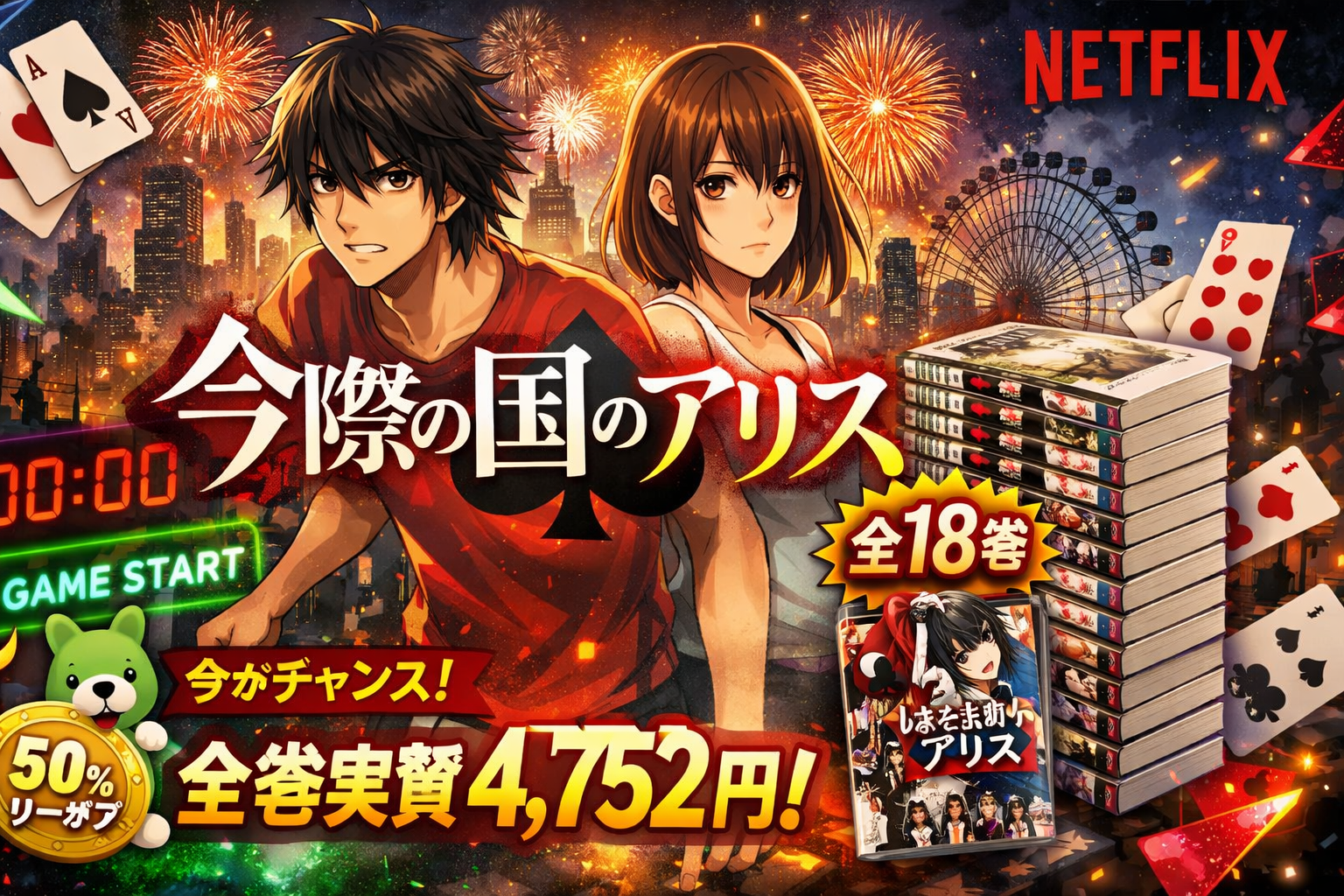 『今際の国のアリス』の原作漫画全18巻は、Amebaマンガで全巻配信中です。新規登録時の「100冊まで50%即時還元クーポン」を使えば、定価9,504円(税込)の全巻セットが実質約4,752円で購入できます。Netflixドラマ シーズン3の配信で注目が再燃している今こそ、原作を一気読みする絶好のタイミングです。