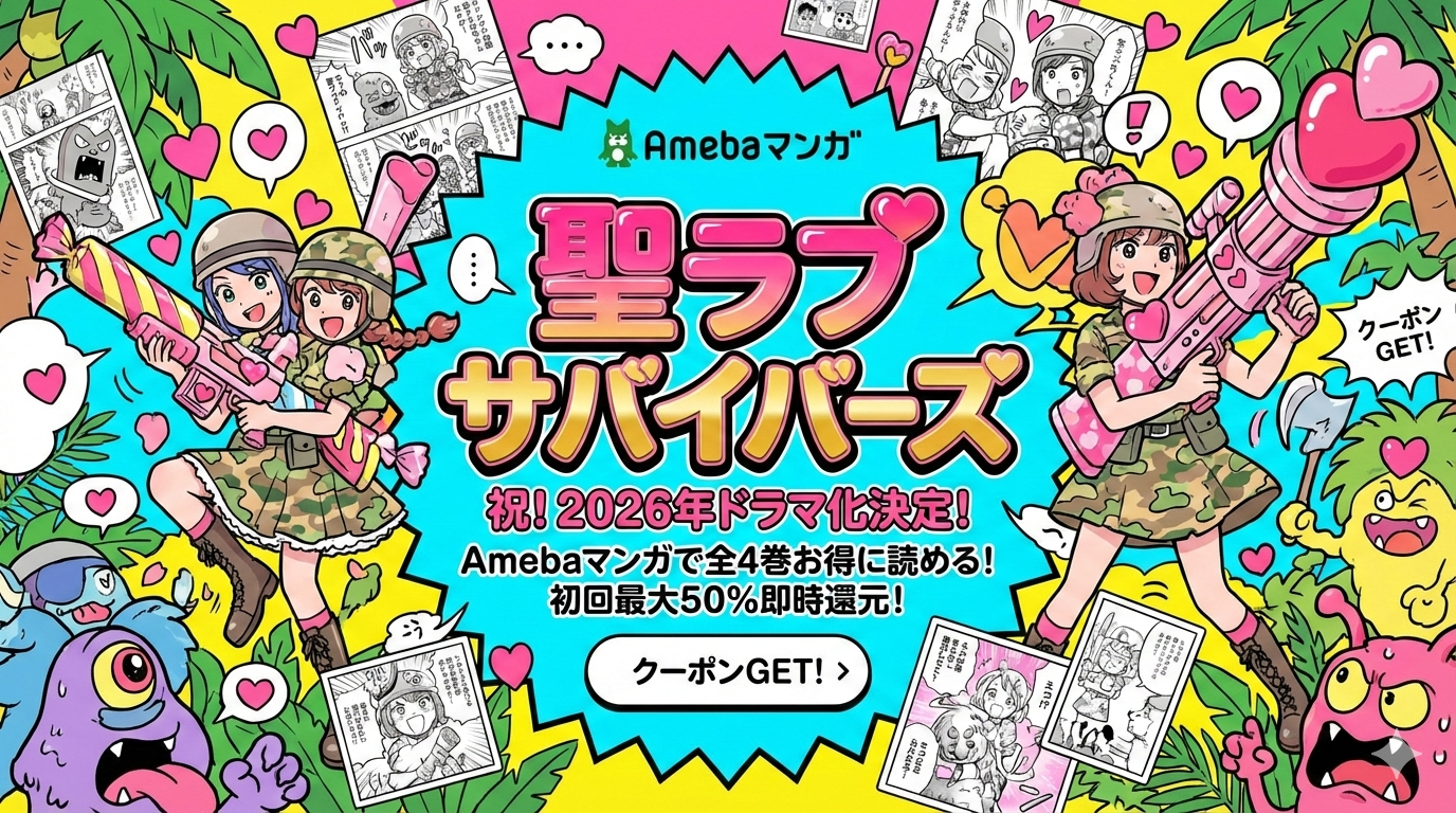 『聖ラブサバイバーズ』の原作漫画全4巻はAmebaマンガで配信中です。初回限定の100冊まで最大50%即時還元クーポンを使えば、全巻合計2,200円相当が実質約1,100円で読めます。2026年1月クールでドラマ化され注目が集まっている今、原作を最もお得に読む方法を詳しくご紹介します。