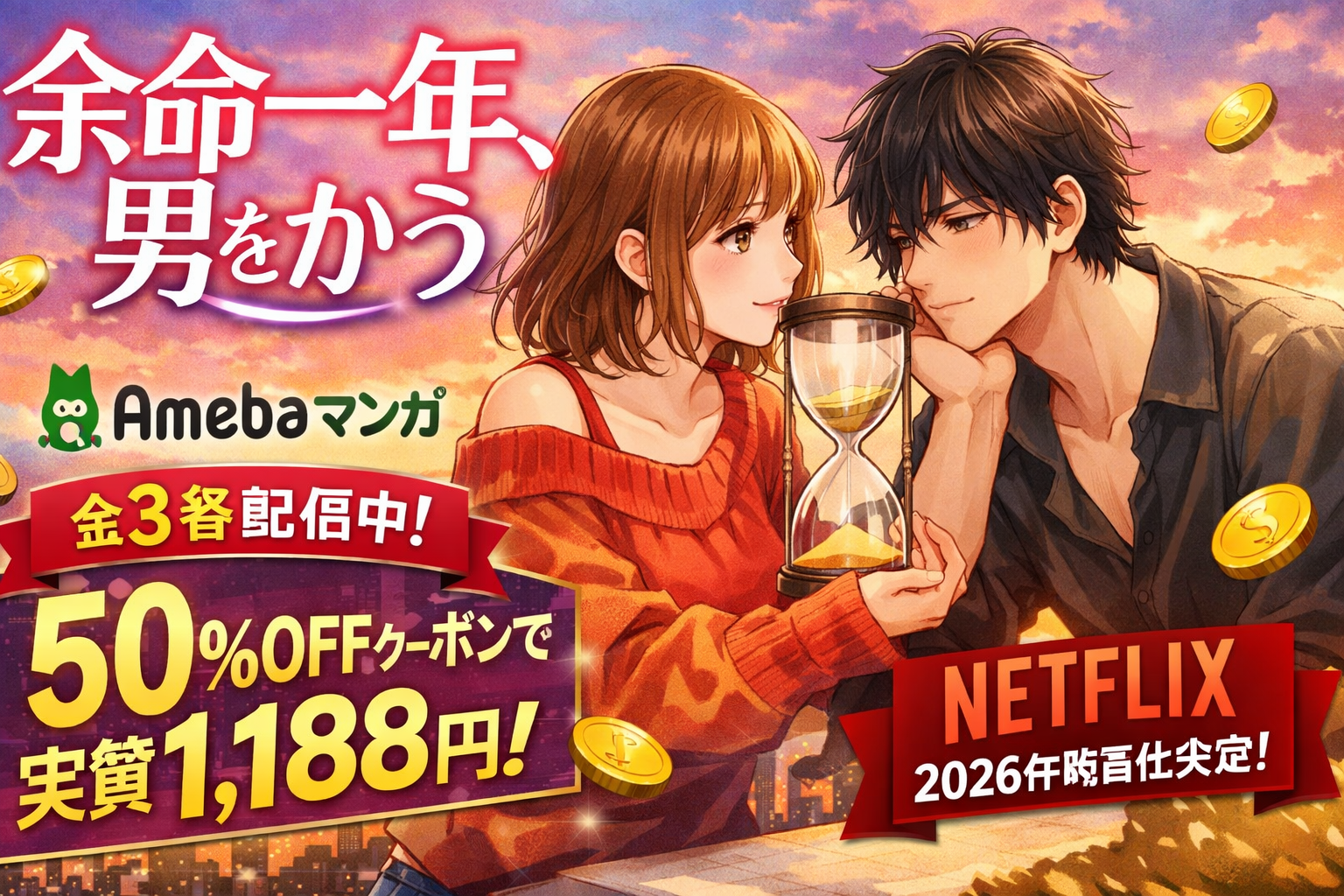 「余命一年、男をかう」の漫画版は、Amebaマンガで全3巻すべて配信中です。新規登録時の100冊まで50%即時還元クーポンを使えば、全巻合計2,376円相当が実質約1,188円で購入できます。2026年Netflix映画化が発表され注目が集まる今、原作漫画をお得に読む方法を詳しくまとめました。